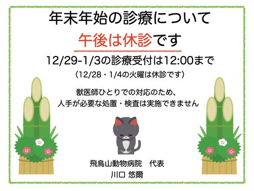 いつも当院ご利用ありがとうございます. 年末年始の診療についてご連絡です. <年末年始の診療> 12/30(水)〜1/3(月) 午前中だけの診療です 受付:9:00〜12:00 12/28,1/5は火曜のため休診です ※以下のご迷惑をおかけします、ご了承ください ・獣医ひとり…
